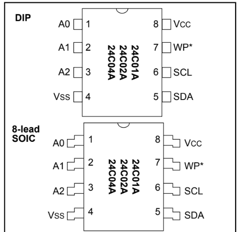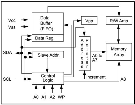 Công ty Microchip Technology Inc. 24C02A là một công ty PROM có thể xóa bằng điện 2K bit. Thiết bị được tổ chức như hình minh họa, với một cổng nối tiếp hai dây tiêu chuẩn giao diện. Công nghệ CMOS tiên tiến cho phép giảm đáng kể nguồn điện trên các thiết bị nối tiếp NMOS. MỘT tính năng đặc biệt trong 24C02A cung cấp bảo vệ ghi phần cứng cho nửa trên của khối. 24C02A có khả năng ghi trang hai byte.