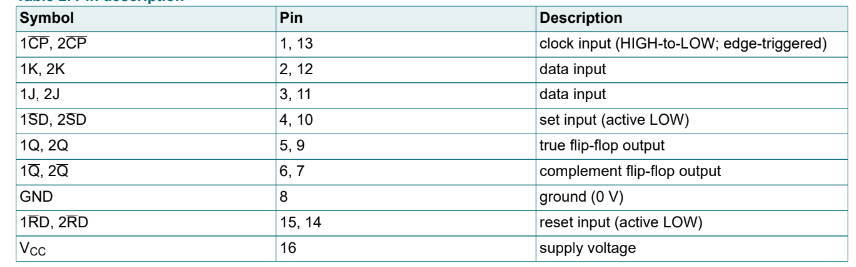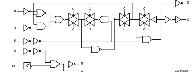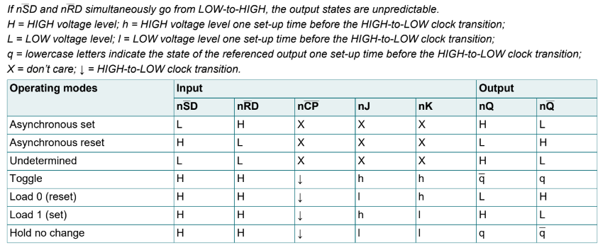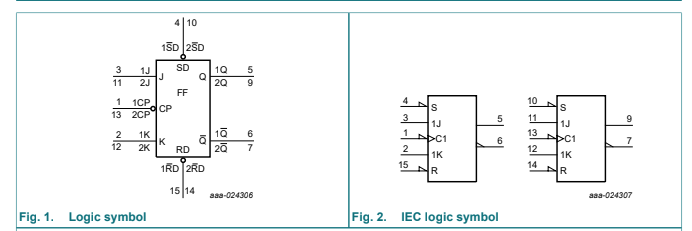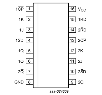 Nó có các đầu vào J và K riêng biệt, đầu vào xung nhịp (nCP), thiết lập (nSD) và đặt lại (nRD). Nó cũng có các đầu ra nQ và nQ bổ sung. Thiết lập và đặt lại là các đầu vào THẤP hoạt động không đồng bộ và hoạt động độc lập với đầu vào xung nhịp. Các đầu vào J và K điều khiển các thay đổi trạng thái của các flip-flop như được mô tả trong bảng chức năng chọn chế độ. Các đầu vào J và K phải ổn định một thời gian thiết lập trước khi chuyển đổi xung nhịp CAO sang THẤP để hoạt động có thể dự đoán được.