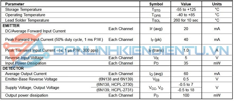 Bảng thông số HCPL-2730