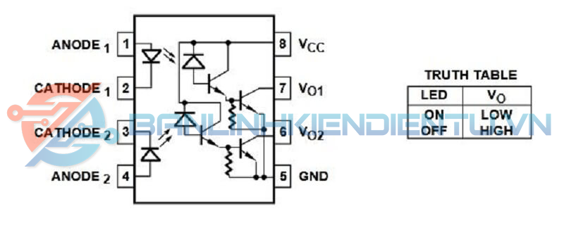 - Bộ ghép quang và HCPL-2730 bao gồm một đèn LED AlGaAs được ghép nối quang học với bộ tách sóng quang Darlington phân tách độ lợi cao