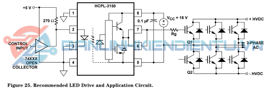 Để tắt IGBT một cách chắc chắn, HCPL-3150 có thông số VOL tối đa rất thấp là 1,0 V. HCPL-3150 hiện thực hóa VOL rất thấp này bằng cách sử dụng bóng bán dẫn DMOS có điện trở 4 Ω (điển hình) trong mạch kéo xuống của nó. Khi HCPL-3150 ở trạng thái thấp, cổng IGBT bị ngắn mạch tới bộ phát Rg + 4 Ω. Minimizinm Rg và độ tự cảm chì từ HCPL-3150 đến cổng IGBT và bộ phát (có thể bằng cách gắn HCPL-3150 trên một bo mạch PC nhỏ ngay phía trên IGBT) có thể loại bỏ nhu cầu về ổ đĩa cổng IGBT âm trong nhiều ứng dụng như được trình bày trong Hình 25. Cần cẩn thận với thiết kế bo mạch PC như vậy để tránh định tuyến dấu vết bộ thu hoặc bộ phát IGBT gần đầu vào HCPL-3150 vì điều này có thể dẫn đến việc ghép các tín hiệu nhất thời không mong muốn vào HCPL-3150 và làm giảm hiệu suất. (Nếu cống IGBT phải được định tuyến gần đầu vào HCPL-3150 thì đèn LED phải được phân cực ngược khi ở trạng thái tắt, để ngăn các tín hiệu nhất thời được ghép từ cống IGBT bật HCPL-3150.)
