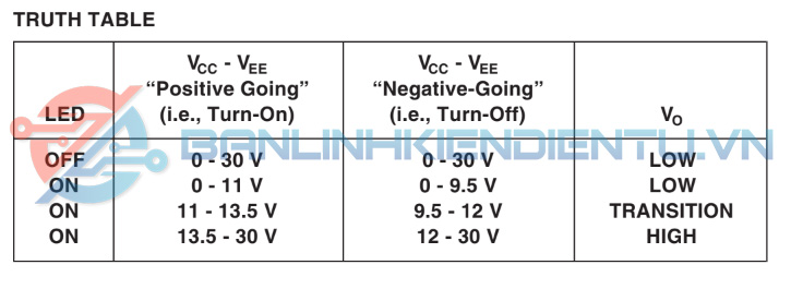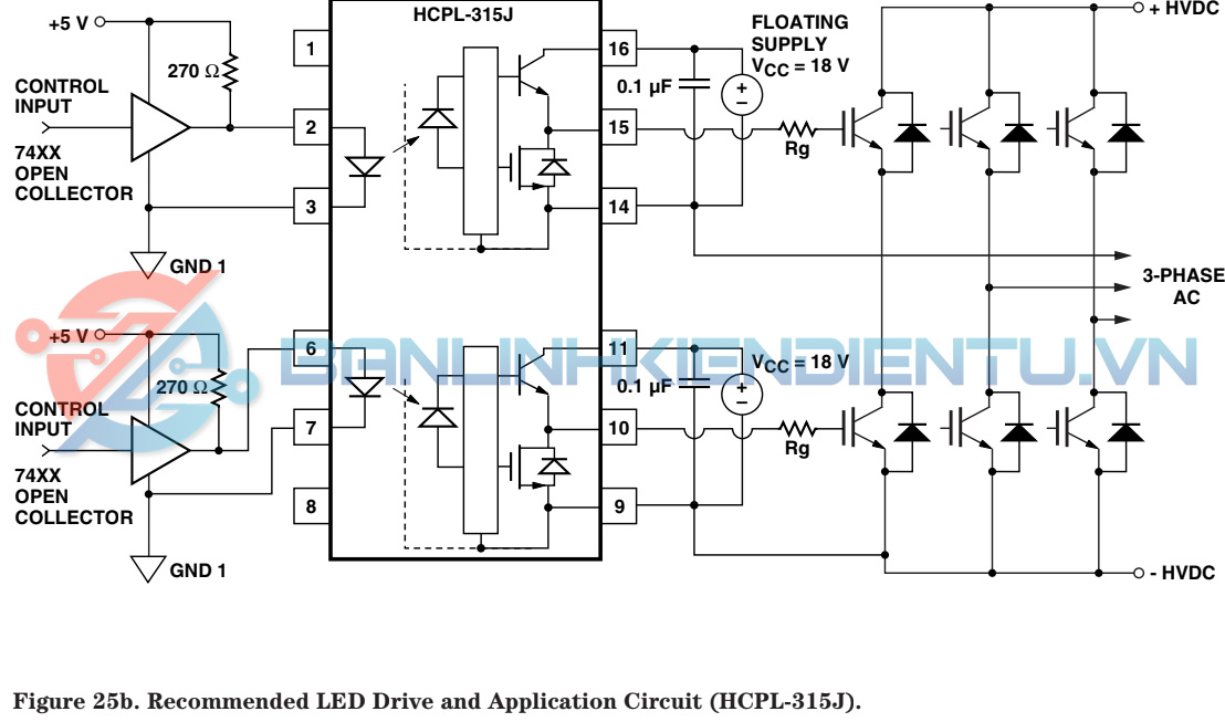 Để tắt IGBT một cách chắc chắn, HCPL-3150/315J có thông số VOL tối đa rất thấp là 1,0 V. HCPL-3150/315J hiện thực hóa VOL rất thấp này bằng cách sử dụng bóng bán dẫn DMOS có điện trở 4 Ω (điển hình) trong mạch kéo xuống. Khi HCPL-3150/315J ở trạng thái thấp, cổng IGBT bị ngắn mạch tới bộ phát Rg + 4 Ω. Giảm thiểu Rg và độ tự cảm chì từ HCPL-3150/ 315J đến cổng IGBT và bộ phát (có thể bằng cách gắn HCPL-3150/315J trên một bo mạch PC nhỏ ngay phía trên IGBT) có thể loại bỏ nhu cầu về ổ đĩa cổng IGBT âm trong nhiều trường hợp. các ứng dụng như trong hình trên. Cần cẩn thận với thiết kế bo mạch PC như vậy để tránh định tuyến dấu vết bộ thu hoặc bộ phát IGBT gần với đầu vào HCPL-3150/315J vì điều này có thể dẫn đến việc ghép các tín hiệu nhất thời không mong muốn vào HCPL-3150 /315J và làm giảm hiệu suất. (Nếu cống IGBT phải được định tuyến gần đầu vào HCPL-3150/315J thì đèn LED phải được phân cực ngược khi ở trạng thái tắt, để ngăn các tín hiệu nhất thời được ghép từ cống IGBT bật HCPL-3150/315J .)