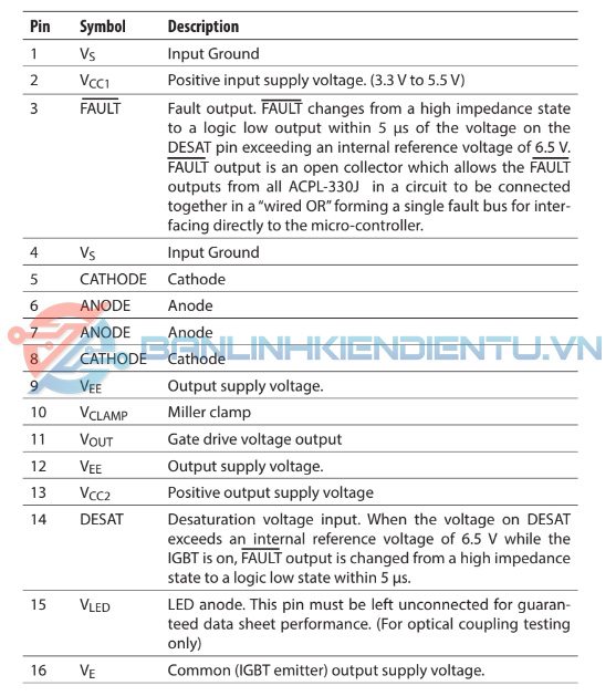 - ACPL-330J chứa đèn LED GaAsP. Đèn LED được ghép quang với một mạch tích hợp có tầng đầu ra nguồn. ACPL-330J lý tưởng cho việc điều khiển IGBT và MOSFET công suất được sử dụng trong các ứng dụng biến tần điều khiển động cơ. Điện áp và dòng điện được cung cấp bởi các bộ ghép quang này khiến chúng phù hợp lý tưởng để điều khiển trực tiếp IGBT có định mức lên tới 1200 V và 100 A. Đối với các IGBT có định mức cao hơn, ACPL-330J có thể được sử dụng để điều khiển một giai đoạn nguồn rời rạc điều khiển cổng IGBT . ACPL-330J có điện áp cách điện VIORM = 891 VPEAK.