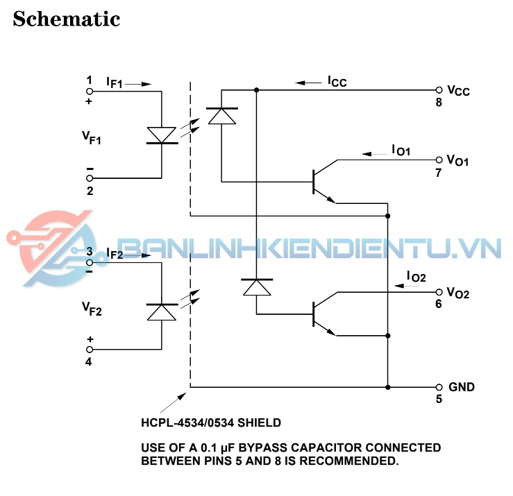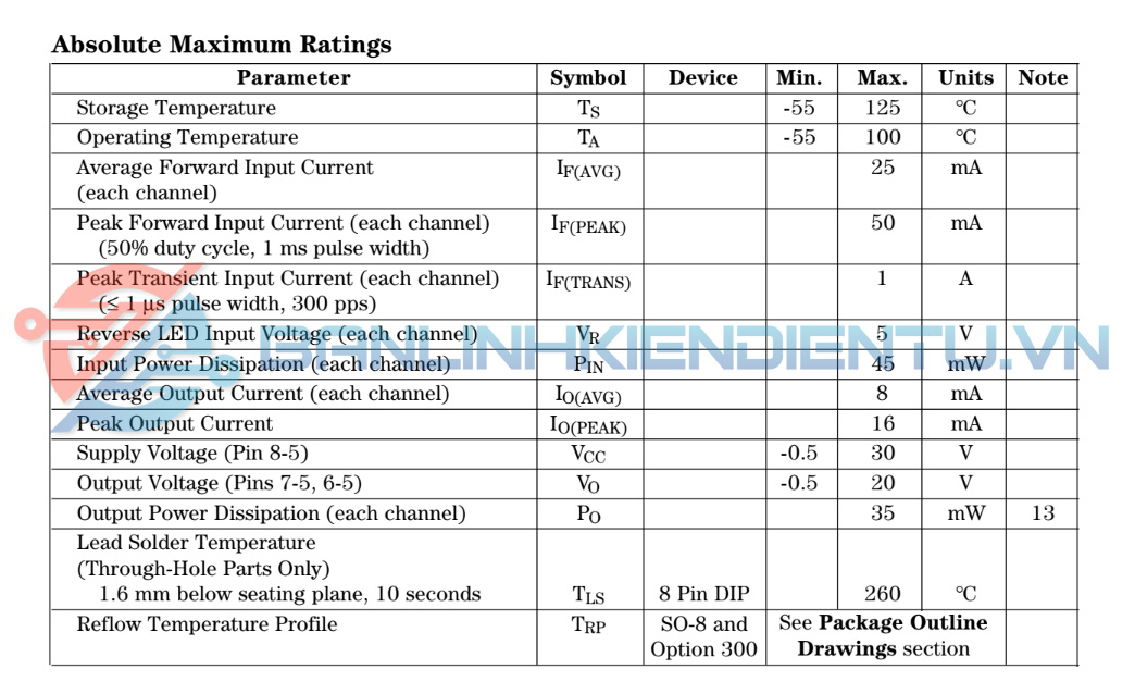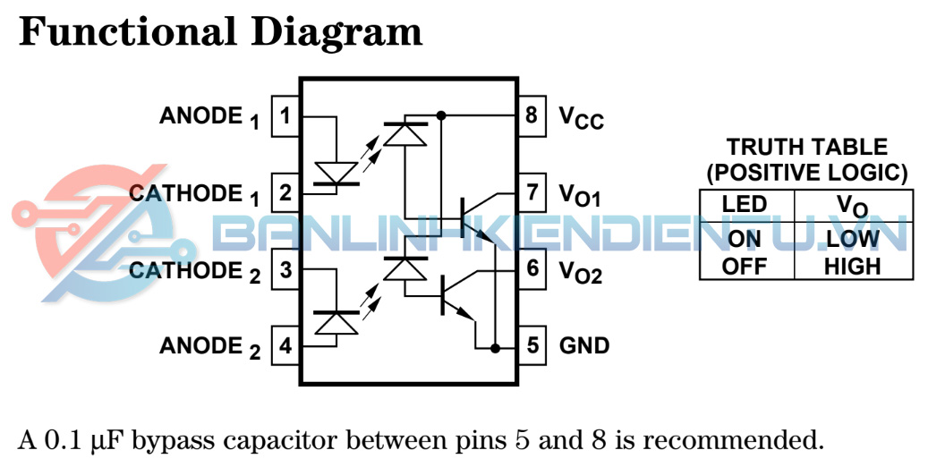 - Bộ ghép quang kênh đôi này chứa một cặp ánh sáng phát ra điốt và máy dò quang tích hợp tors với cách điện giữa đầu vào và đầu ra. Kết nối riêng cho độ lệch và đầu ra photodiode bộ thu bóng bán dẫn tăng tăng tốc lên gấp trăm lần của một phototransistor thông thường khớp nối bằng cách giảm cơ sở- điện dung của bộ thu