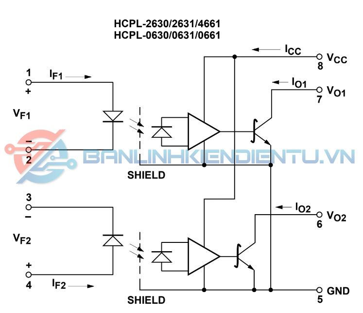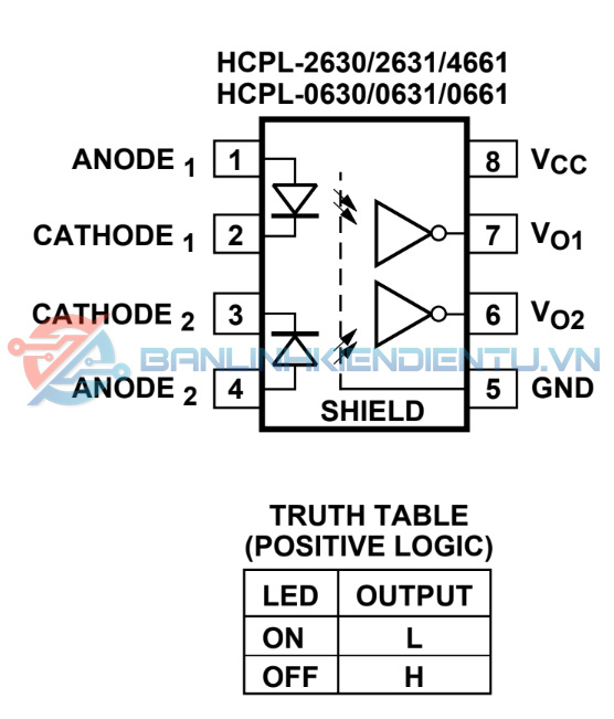 - HCPL-4661 là cổng ghép nối quang học kết hợp điốt phát sáng GaAsP và bộ tách sóng quang tích hợp độ lợi cao. Đầu vào kích hoạt cho phép máy dò được kích hoạt