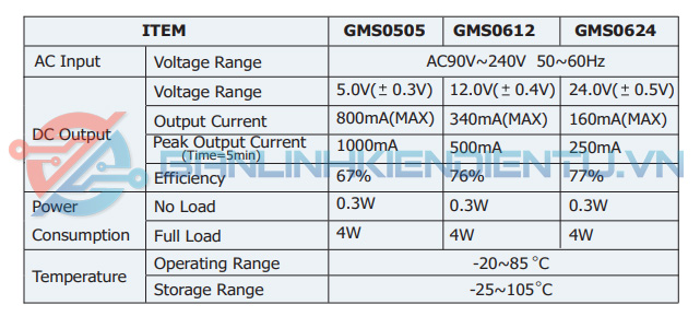 GMS0505 là bộ chuyển mạch AC-DC nhỏ gọn, được sử dụng để chuyển đổi dòng điện xoay chiều (AC) từ dải điện áp rộng 90V-240V sang dòng điện một chiều (DC) ổn định 5V. Với công suất 4W và dòng điện đầu ra tối đa 800mA, thiết bị là lựa chọn hoàn hảo cho các mạch điện tử và hệ thống cần nguồn DC nhỏ nhưng hiệu suất cao. Đây là sản phẩm hàng tháo máy, đã qua sử dụng nhưng vẫn đảm bảo chất lượng hoạt động tốt.