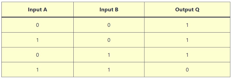 Mọi đầu ra từ cổng AND đều bị đảo ngược bởi cổng NOT. Vì vậy, nói một cách đơn giản, cổng NAND là cổng logic chỉ cho đầu ra THẤP khi tất cả các đầu vào ở mức CAO như được hiển thị trong bảng chân lý bên dưới.