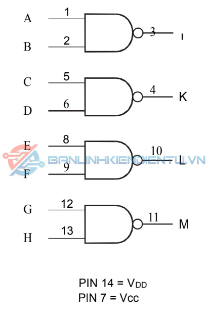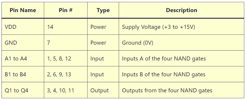 CD4011 là chip CMOS có bốn cổng NAND. Bởi vì mỗi cổng có hai đầu vào và có 4 cổng bên trong nên nó thường được gọi là Cổng NAND 2 đầu vào.Nó là một mạch tích hợp cổng NAND bốn góc, có nghĩa là nó bao gồm 4 cổng NAND trong một khối duy nhất. Nó dựa trên logic CMOS. Tất cả các đầu vào và đầu ra đều được thiết kế theo mức điện áp logic CMOS. Nó được sử dụng để thực thi logic NAND hoặc bạn có thể sử dụng kết hợp bốn cổng để thực hiện thao tác ‘AND A= X x Y’ hoặc ‘OR B = X+Y’. Tất cả các đầu vào và đầu ra logic của NAND. Các chân I/O được đệm cho thông lượng.