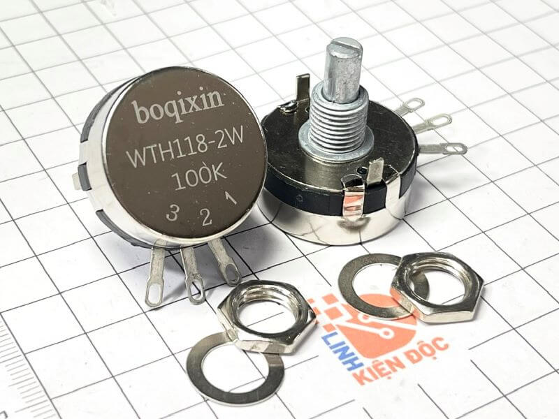 - Điện trở định danh: 100KΩ, có thể điều chỉnh được trong khoảng từ 0 đến 100KΩ bằng cách xoay trục.