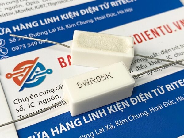 Điện trở sứ 5WR05K là loại điện trở công suất cao, có giá trị điện trở rất nhỏ — chỉ 0.05 ohm (50 milliohm). Sản phẩm được thiết kế với lớp vỏ gốm sứ trắng cách điện, có khả năng chịu nhiệt cao và tản nhiệt tốt. Với công suất định mức 5W, điện trở này lý tưởng cho các ứng dụng cần đo dòng lớn, hạn dòng, hoặc làm tải xả trong các mạch nguồn và thiết bị điện tử công nghiệp.