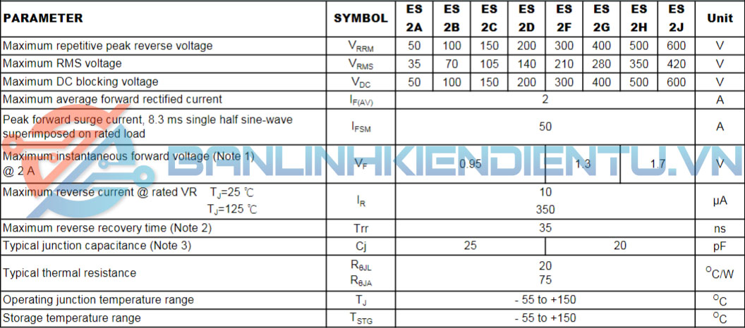 ES2J SF28 SMA Diode chỉnh lưu 2A/600V DO-214AC