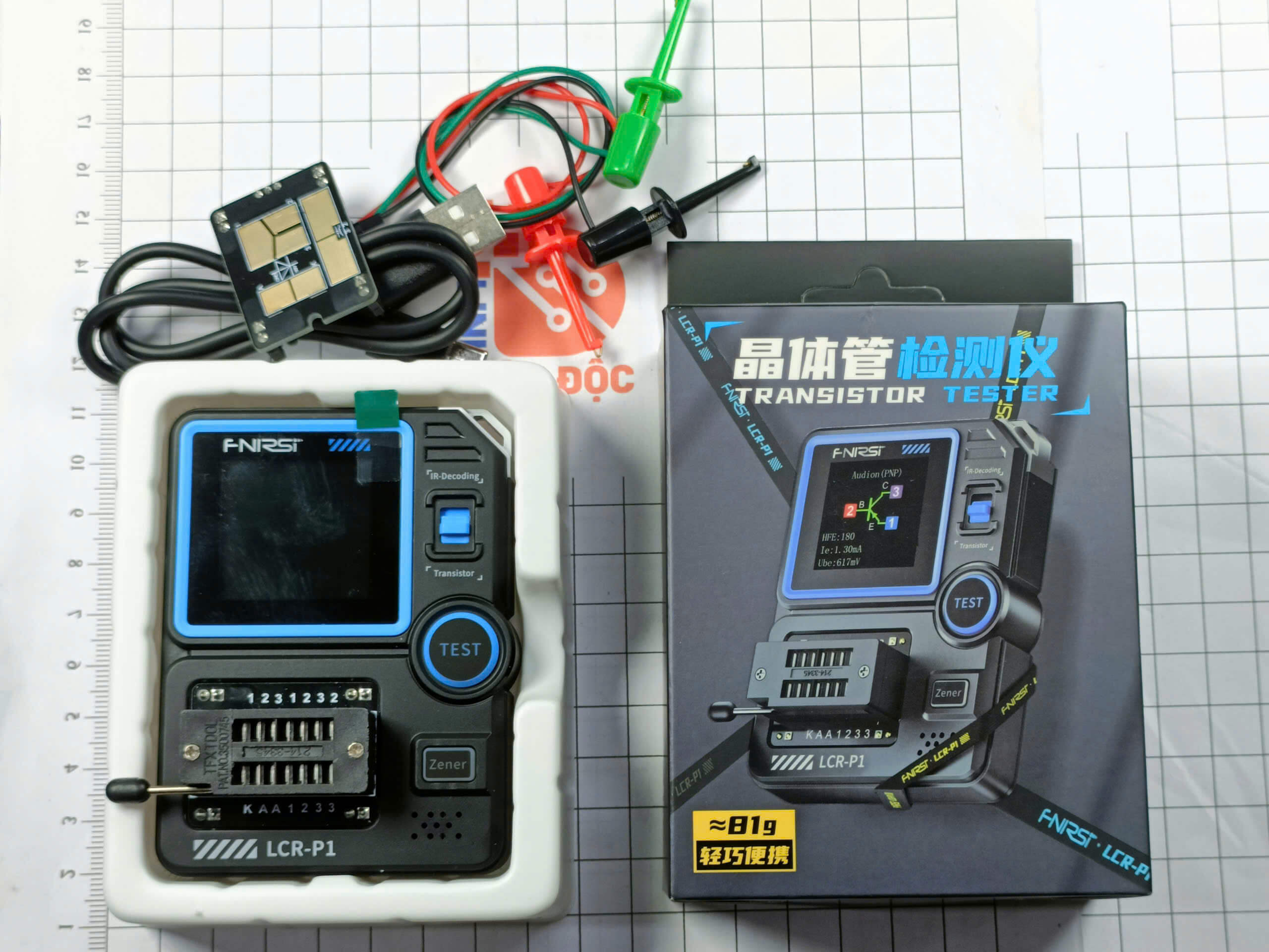 Có socket ZIF 14 chân + dây kẹp hỗ trợ đo linh kiện SMD và linh kiện rời.