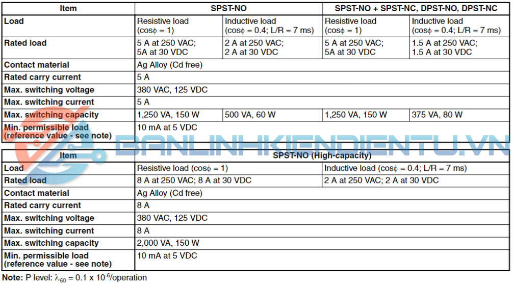 - Điện áp cách điện giữa các tiếp điểm (Contact-to-Contact Insulation Voltage): 500V AC