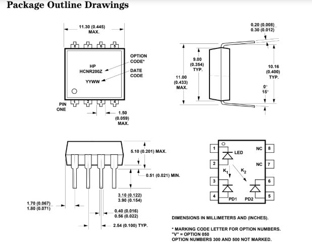 - HCNR200 bao gồm đèn LED AlGaAs hiệu suất cao chiếu sáng hai điốt quang được kết hợp chặt chẽ. Photodiode đầu vào có thể được sử dụng để giám sát và do đó ổn định đầu ra ánh sáng của đèn LED. Kết quả là, đặc tính phi tuyến và độ trôi của đèn LED hầu như có thể bị loại bỏ. Photodiode đầu ra tạo ra dòng quang có quan hệ tuyến tính với ánh sáng phát ra của đèn LED. Sự kết hợp chặt chẽ của các điốt quang và thiết kế tiên tiến của gói đảm bảo tính tuyến tính cao và đặc tính khuếch đại ổn định của bộ ghép quang