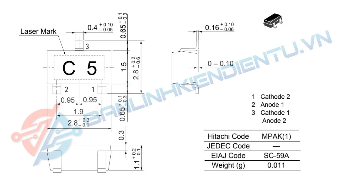 Diode này thường được đóng gói trong vỏ MPAK (Mini Package), là một loại vỏ dán bề mặt (SMD) nhỏ gọn, phù hợp cho việc lắp ráp mật độ cao và tốc độ cao.