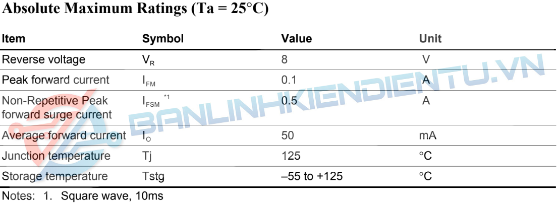 Vì thông tin chi tiết về HSM107S khá hiếm và thường nằm trong các tài liệu cũ của Hitachi/Renesas, các thông số dưới đây là ước tính dựa trên các diode Schottky tương tự dùng cho mục đích bảo vệ:
