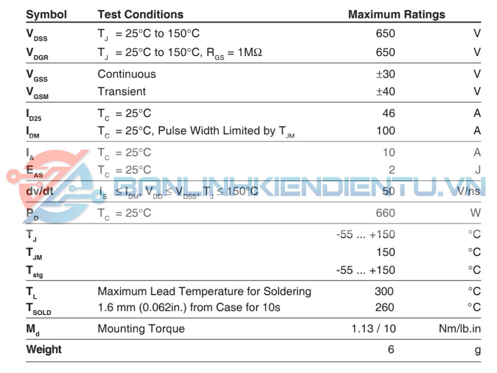 IXFH46N65X2 là một MOSFET N-Channel công suất cao do Littelfuse (trước đây là IXYS) sản xuất. Linh kiện này thuộc dòng X2 Class High Performance MOSFETs, được tối ưu cho các ứng dụng điện áp cao, dòng lớn và yêu cầu hiệu suất chuyển mạch nhanh. Đóng gói TO-247 giúp dễ dàng lắp tản nhiệt và sử dụng trong các mạch công suất công nghiệp.