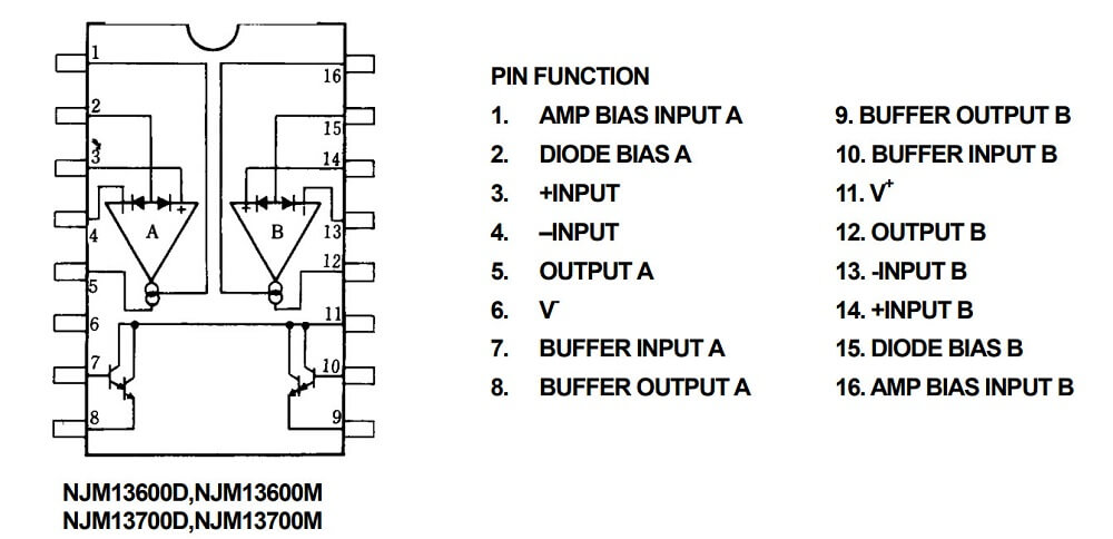NJM13600/13700 bao gồm hai trans điều khiển hiện tại mỗi bộ khuếch đại độ dẫn có đầu vào vi sai và bộ đẩy đầu ra kéo. Hai bộ khuếch đại chia sẻ nguồn cung cấp chung nhưng mặt khác hoạt động độc lập. Điốt tuyến tính hóa là được cung cấp ở đầu vào để giảm biến dạng và cho phép đầu vào cao hơn