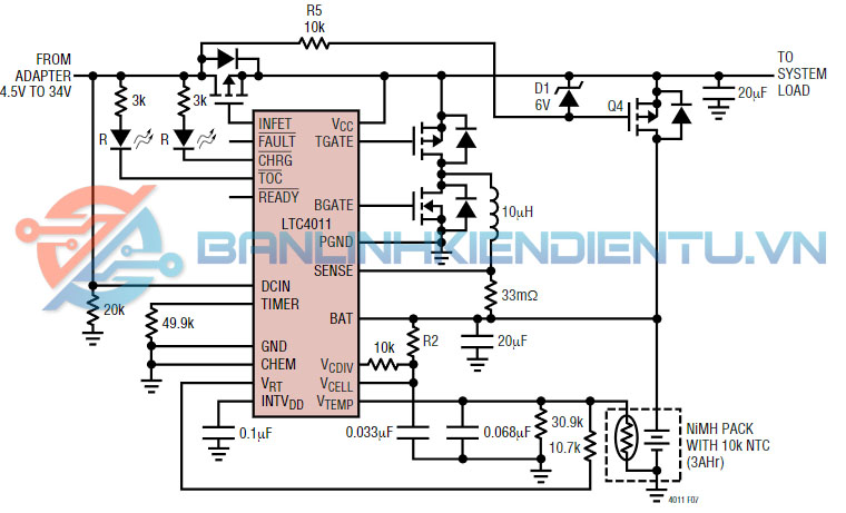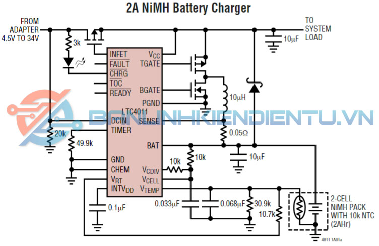 LTC4011 có thể đồng thời sử dụng cả kỹ thuật chấm dứt sạc nhanh –∆V và ∆T/∆t và có thể phát hiện nhiều lỗi pin khác nhau. Nếu cần, một lần sạc đầy sẽ tự động được áp dụng cho pin NiMH sau khi sạc nhanh hoàn tất. IC cũng sẽ tiếp tục sạc nếu pin tự xả sau một chu kỳ sạc đầy. Tất cả các hoạt động sạc LTC4011 đều được xác định theo thời gian sạc thực tế và điện áp cell trung bình tối đa. Sạc cũng có thể được kiểm soát theo giới hạn nhiệt độ tối thiểu và tối đa. Các thông số kết thúc sạc nhanh NiMH hoặc NiCd có thể lựa chọn bằng chân cắm.
