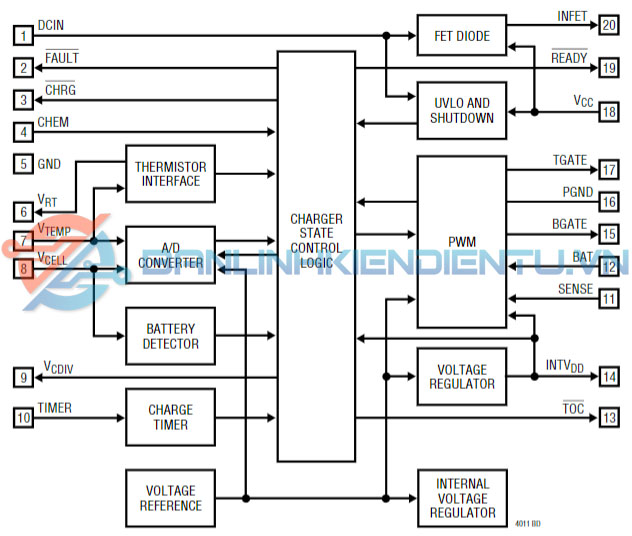 LTC4011 cung cấp giải pháp sạc nhanh pin niken hoàn chỉnh, tiết kiệm chi phí trong một gói nhỏ sử dụng một vài thành phần bên ngoài. Bộ điều khiển nguồn dòng điện PWM 550kHz và tất cả các mạch điều khiển khởi tạo, giám sát và chấm dứt sạc cần thiết đều được bao gồm. LTC4011 tự động cảm nhận sự hiện diện của bộ chuyển đổi DC và việc lắp hoặc tháo pin. Pin đã xả nhiều được sạc trước bằng dòng điện nhỏ giọt.
