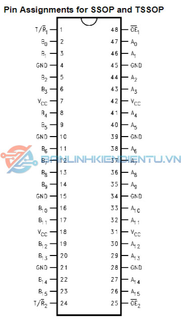 - Kiểu đóng gói: Phổ biến trong các gói dán bề mặt như TSSOP-48 (Thin Shrink Small Outline Package – 48 chân), SSOP-48, hoặc TVSOP-48.