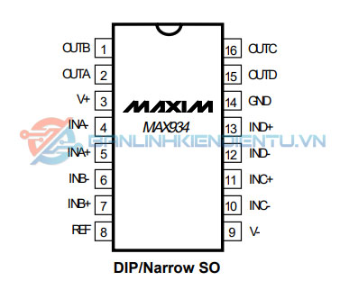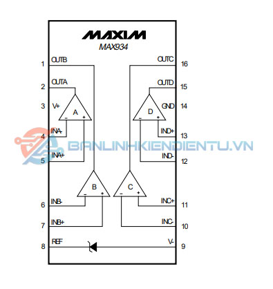 - Bộ so sánh điện áp chính xác: MAX934 là bộ so sánh vi sai với độ lệch điện áp đầu vào cực thấp, giúp đảm bảo hiệu suất ổn định trong các ứng dụng đòi hỏi độ chính xác cao.