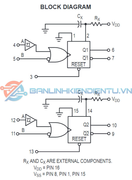 MC14538B là một bộ dao động đơn ổn định đa hài kép, có thể kích hoạt lại, có thể đặt lại. Nó có thể được kích hoạt từ bất kỳ cạnh nào của xung đầu vào và tạo ra xung đầu ra chính xác trên một phạm vi rộng về độ rộng, thời lượng và độ chính xác của xung này được xác định bởi các thành phần thời gian bên ngoài, CX và RX. Độ rộng xung đầu ra = (Cx) (Rx) trong đó: