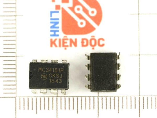 MC34151 là trình điều khiển tốc độ cao đảo ngược kép được thiết kế riêng cho các ứng dụng yêu cầu mạch kỹ thuật số dòng điện thấp để điều khiển tải điện dung lớn với tốc độ quay cao. Các thiết bị này có dòng điện đầu vào thấp khiến chúng tương thích với logic CMOS và LSTTL, độ trễ đầu vào để chuyển mạch đầu ra nhanh không phụ thuộc vào thời gian chuyển tiếp đầu vào và hai đầu ra cực totem dòng điện cao lý tưởng để điều khiển MOSFET công suất. Ngoài ra còn có khóa điện áp thấp với độ trễ để ngăn hệ thống hoạt động không ổn định ở điện áp cung cấp thấp. Các ứng dụng điển hình bao gồm nguồn điện chuyển mạch, bộ chuyển đổi DC sang DC, bộ nhân đôi điện áp bơm tụ điện/bộ biến tần và bộ điều khiển động cơ. Các thiết bị này có sẵn trong các gói lắp trên bề mặt và lắp trên hai dòng.