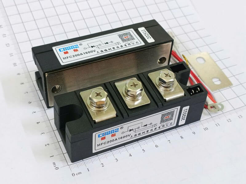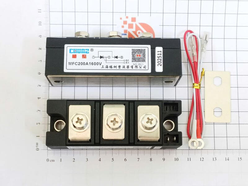 MFC200A-1600V là thyristor công suất (SCR – Silicon Controlled Rectifier) dạng module, được sử dụng trong các mạch điện tử công suất lớn. Linh kiện này có khả năng chịu dòng điện định mức 200A và điện áp tối đa 1600V, phù hợp cho các hệ thống điều khiển và chuyển đổi năng lượng điện trong công nghiệp. Thyristor hoạt động như một công tắc bán dẫn có điều khiển, cho phép dòng điện đi qua khi có tín hiệu kích vào chân Gate và tiếp tục dẫn cho đến khi dòng điện giảm xuống dưới mức giữ. Nhờ khả năng chịu dòng và điện áp lớn, MFC200A-1600V được sử dụng rộng rãi trong các mạch chỉnh lưu, điều khiển công suất và điều khiển động cơ.