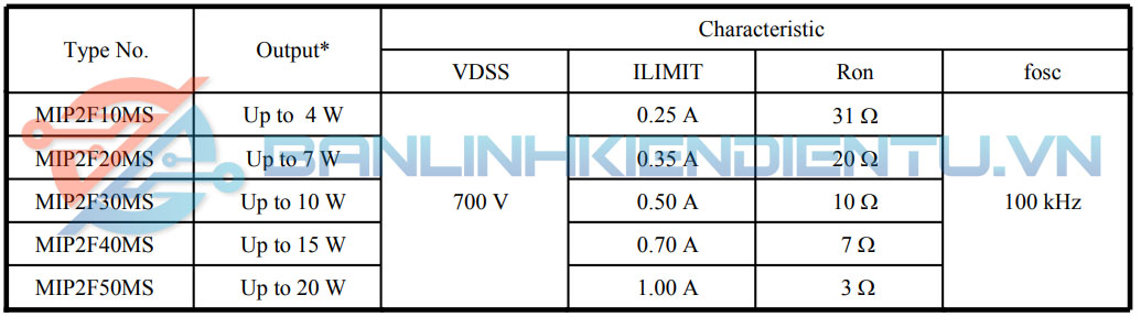 MIP2F5 là IPD hiệu suất cao được thiết kế cho bộ sạc pin 20W. Nó có mạch bảo vệ tích hợp cần thiết cho mạch sạc nguồn điện nhỏ gọn. Điều này cho phép giảm đáng kể các bộ phận được kết nối bên ngoài. Nó cung cấp điều khiển PWM khi tải bình thường được áp dụng và điều khiển không liên tục với tải thấp. Điều này dẫn đến hiệu suất cao hơn cho tải rất thấp đến tối đa, đồng thời cũng tiết kiệm điện năng trong chế độ chờ.