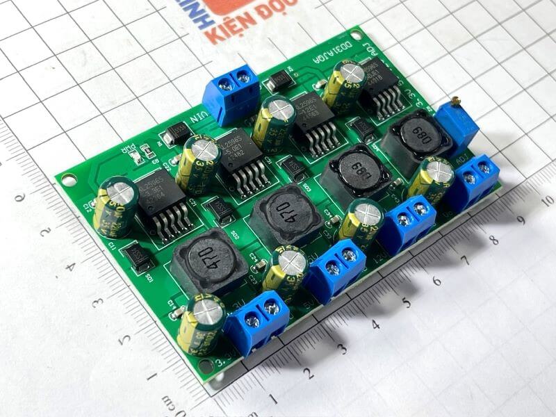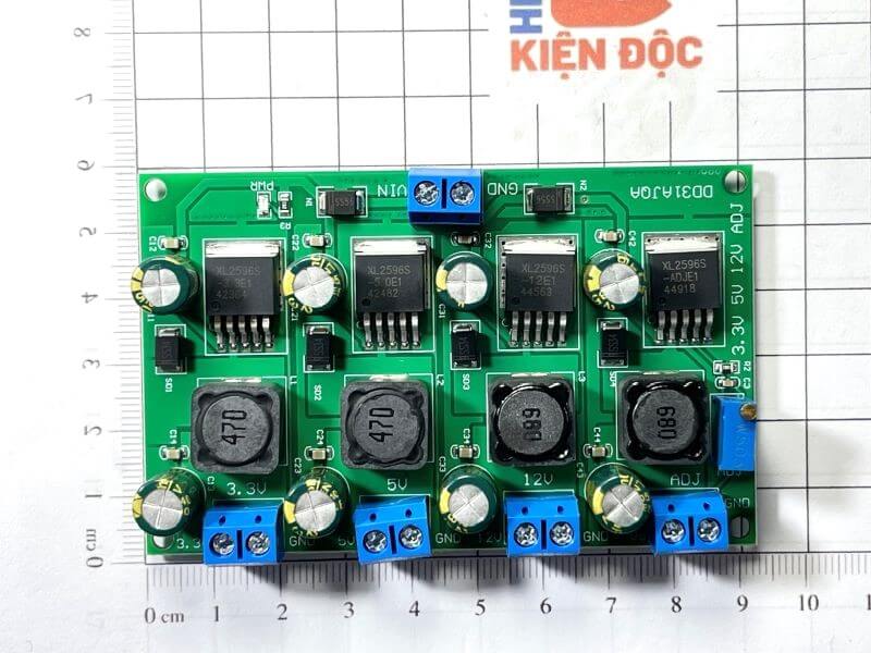 DD31AJQA là module DC-DC buck giảm áp nhiều kênh, tích hợp 4 ngõ ra độc lập trên cùng một mạch. Mỗi kênh cung cấp điện áp cố định như 3.3V, 5V, 12V (tùy phiên bản) với dòng tối đa khoảng 3A. Module dùng để hạ áp từ nguồn DC cao xuống nhiều mức điện áp khác nhau để cấp cho vi điều khiển, cảm biến, mạch logic và thiết bị ngoại vi.