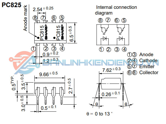 PC825 là một IC quang cách ly hai kênh (dual optocoupler) tích hợp trong cùng một vỏ DIP-8, được dùng để cách ly tín hiệu điều khiển giữa mạch điều khiển logic (MCU, PLC…) và mạch công suất nhằm bảo vệ, chống nhiễu, và cô lập điện áp.