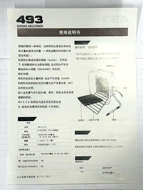 Quạt hút khói HAKKO 493 được thiết kế để hút và lọc khói hàn thiếc, giúp bảo vệ sức khỏe của người làm việc trong các môi trường hàn, đặc biệt là trong ngành điện tử. Sản phẩm này được trang bị tấm lọc cacbon, giúp loại bỏ các khí độc hại và mùi khó chịu hiệu quả.