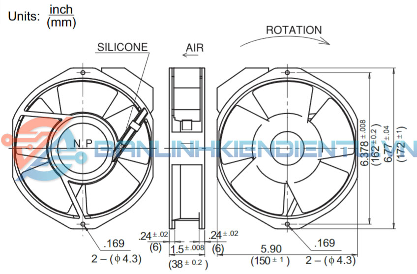 - Kích thước lớn: Quạt có kích thước đường kính 172 mm và độ dày 50 mm, cho phép tạo ra luồng không khí lớn để làm mát các thiết bị công nghiệp.