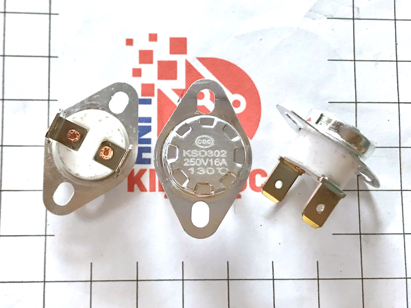 Vật liệu vỏ (nếu có): nhiều loại KSD302 dùng vỏ ceramic (hoặc kim loại tùy phiên bản) — ví dụ bản 130°C là ceramic bimetalic theo Scemo Systems.