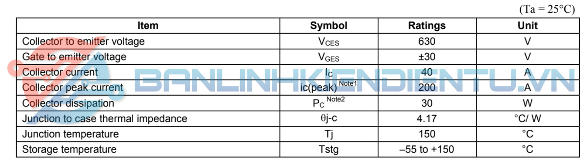 - Điện áp tối đa (Vce): 630V, giúp bảo vệ trong các ứng dụng yêu cầu điện áp cao.