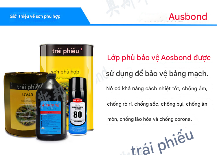 Ausbond 98 là loại sơn phủ bảo vệ mạch điện tử (Three-proof paint) cao cấp, được sản xuất trên nền tảng polyurethane thân thiện môi trường, không chứa benzen độc hại. Sản phẩm chuyên dùng để phủ lên PCB, bo mạch chủ, mạch nguồn, mạch điều khiển công nghiệp nhằm bảo vệ linh kiện và đường mạch khỏi tác động xấu của môi trường.