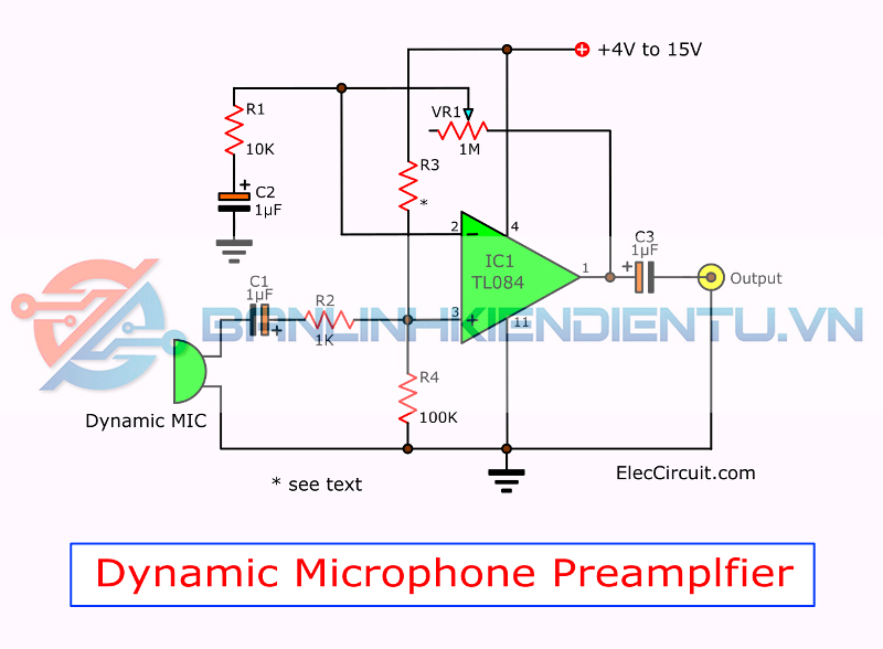 Xem trong mạch. Nó có một vài thành phần. Chúng ta sẽ sử dụng TL084 làm mạch tiền khuếch đại Microphone động.