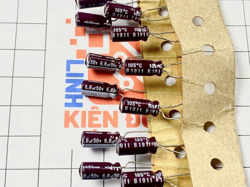 - Điện dung: 6.8µF, là giá trị nhỏ phù hợp cho các ứng dụng ổn định điện áp và lọc tín hiệu trong các mạch điện tử nhỏ gọn.